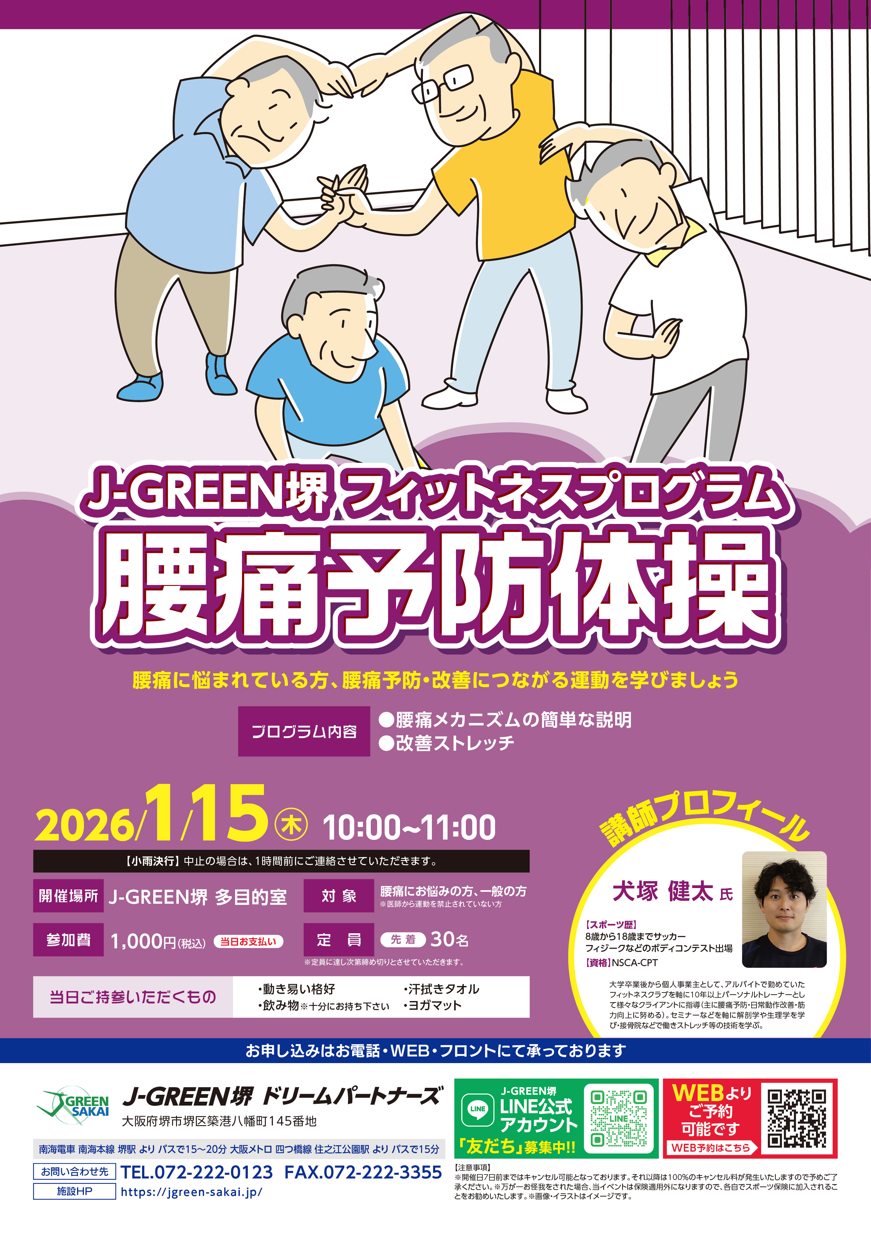 デスクワークや日々の生活で腰痛に悩まれている方を主に対象とし、運動(ストレッチ含む)による改善予防を図る。