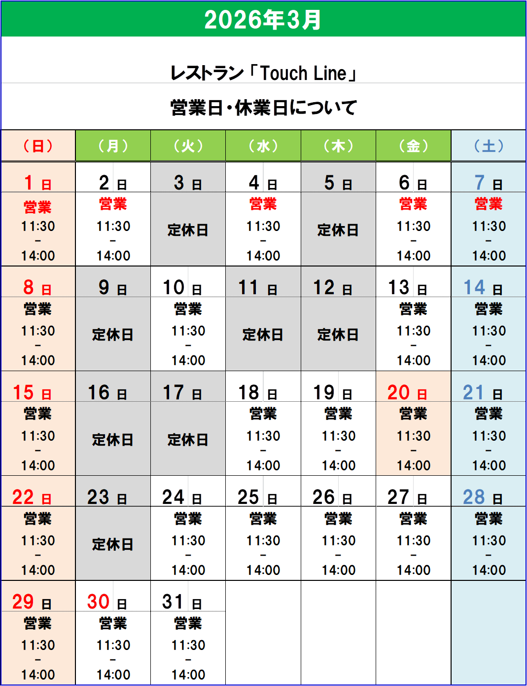 詳しくはHP及びSNSに掲載の「TOUCH LINE 営業時間のご案内」をご確認ください。