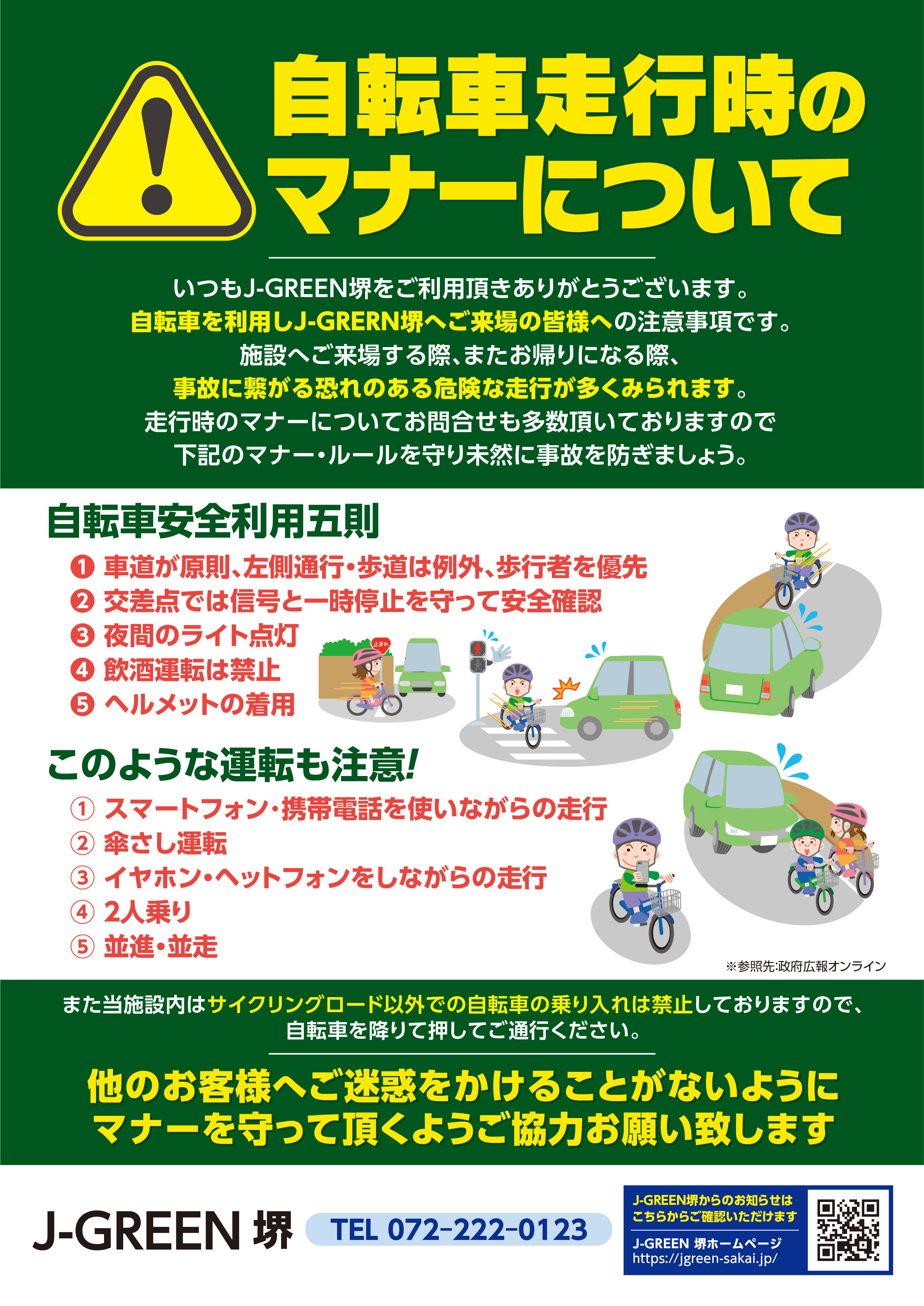 J-GREEN堺のある地区は、施設へご来場される皆様だけでなく、たくさんの方がお住まいでお仕事などでも多くの人が来られています。地域の方、近隣住民の方への迷惑となる行為はやめましょう。